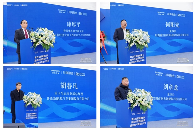 世界华人协会副主席、中非经济合作发展委员会专家组组长康厚平先生为活动致开幕辞,从宏观层面阐述了新能源物流发展的战略意义与未来趋势。接着川海融合(四川)建设发展有限公司董事长何阳光先生在发言中感谢创维汽车的携手与信赖,也致敬一线员工的辛勤付出。随后,开沃新能源汽车集团股份有限公司重卡生态事业部总经理胡春凡先生感谢各位伙伴的信任,让创维汽车新能源重卡正式投入川渝藏绿色保供运输场景。最后深圳市润杰新能源科技有限公司董事长刘章龙先生感谢各方支持,回顾了项目从蓝图到落成的奋斗历程。