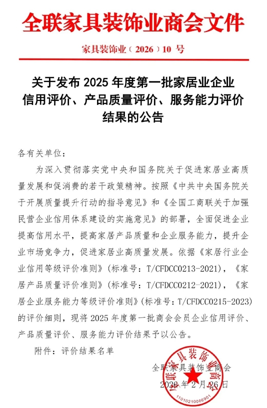 本次评选是全联家具装饰业商会为深入贯彻落实党中央、国务院关于推动家居产业高质量发展、激发消费市场活力的政策要求开展的权威评定,严格依照《中共中央国务院关于开展质量提升行动的指导意见》《全国工商联关于加强民营企业信用体系建设的实施意见》等部署,依据《家居行业企业信用等级评价准则》《家居产品质量评价准则》《家居企业服务能力等级评价准则》三大专业准则细则进行综合考评。评选过程坚持客观性、公正性、公开性原则,从企业信用体系建设、产品质量管控、全流程服务能力、创新发展能力等多维度综合考核,旨在推动家居企业提质升级,助力中国家居产业迈向高质量发展新征程。
