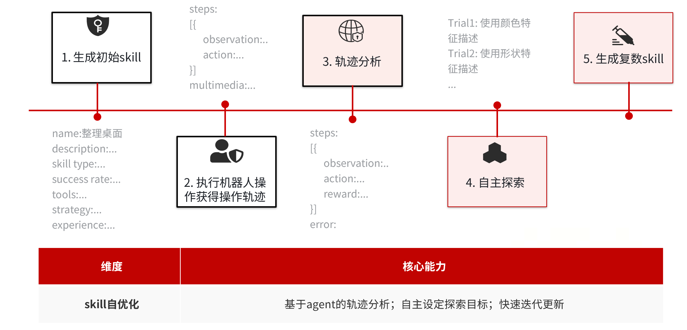Skill本质是“机器人原子动作的组合与封装”(如“抓取→移动→放置”的组合),自优化的核心逻辑是“数据驱动的迭代”,其底层原理分为三个关键环节: