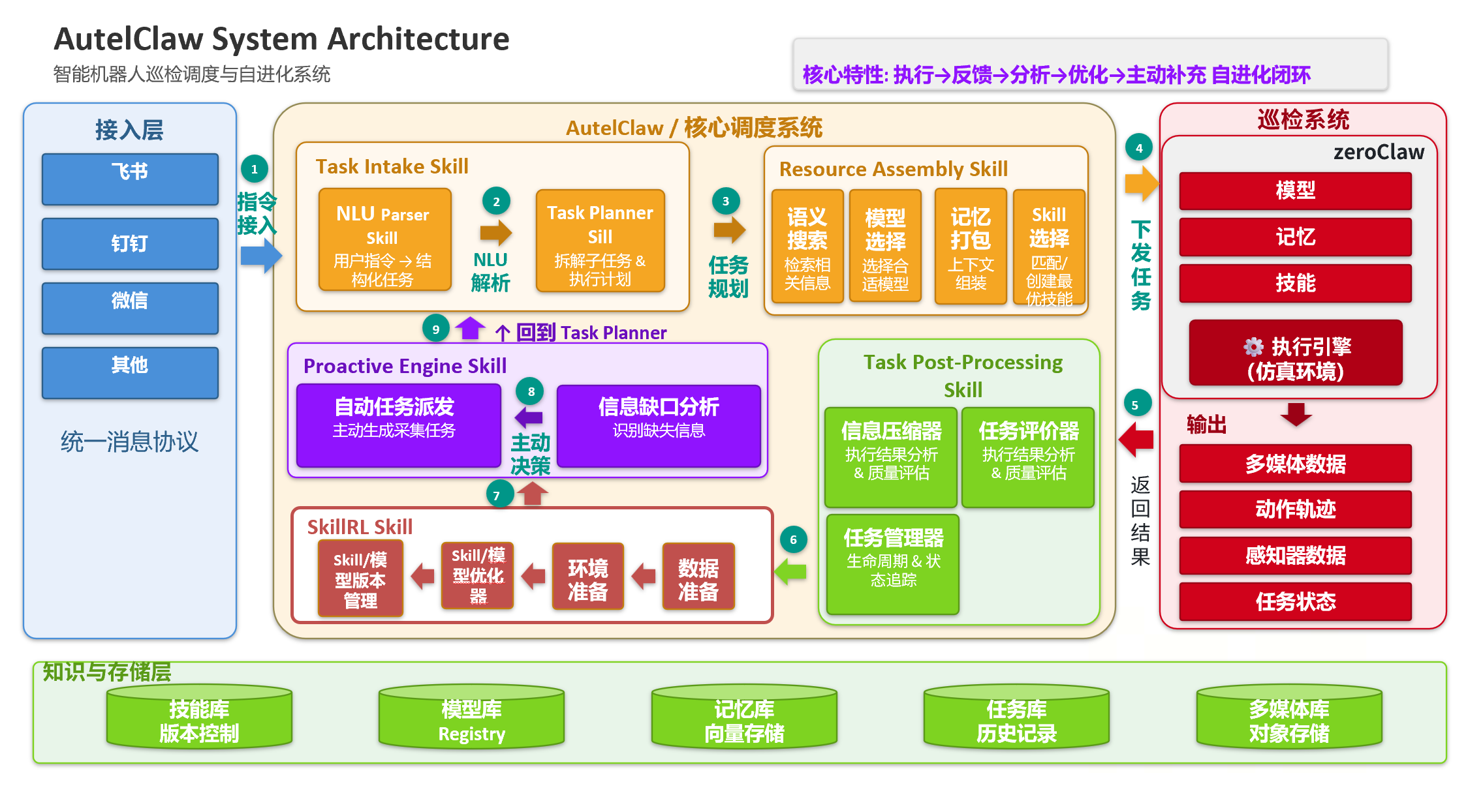 核心定位:以Skill自优化为主线,构建“任务→Skill→执行→数据反馈→Skill再优化”的专属闭环,通过Skill对具身系统的原子能力进行组合,形成可复用的复杂能力,最终实现多机型、多场景的稳定运行。